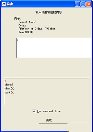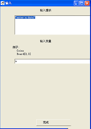 3、双击刚刚添加的哪个输入框,会出现一个提示框,在输入提示框中输入提示信息,注意提示信息要用英文的双引号包括起来。在输入变量中输入变量名。完成之后,单击"完成"。