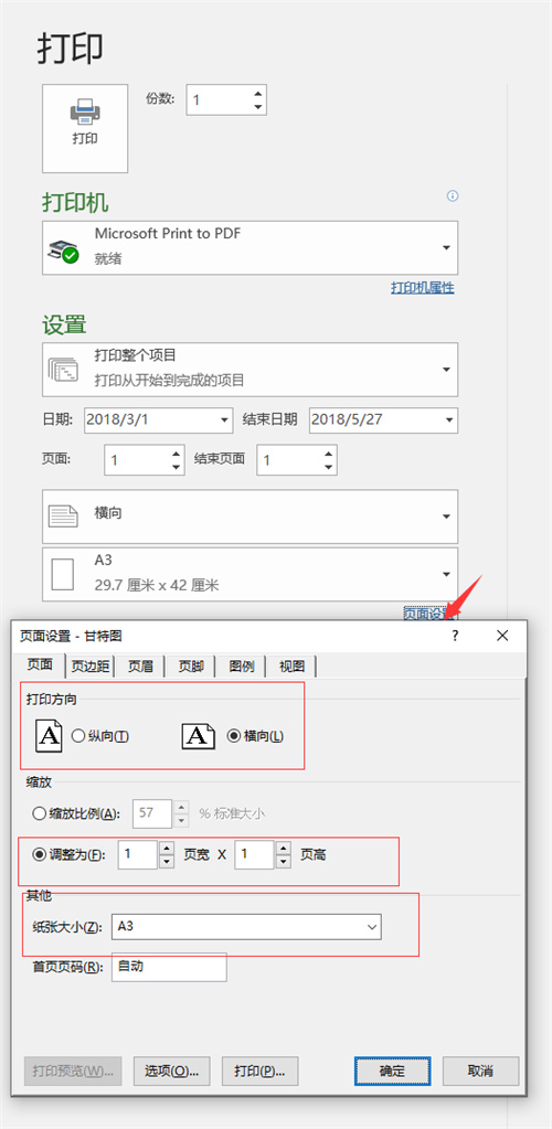 2、打印机选择Microsoft Print to PDF,再点击页面设置;