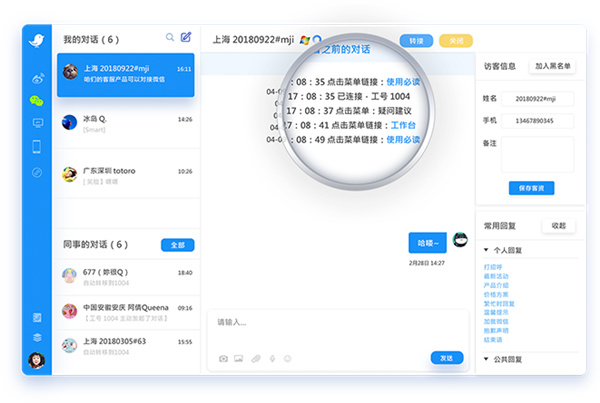 实时显示访客浏览轨迹,保存聊天记录,随时查询,主动出击,挖掘潜在客户。