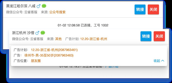 在用户进入网站时,云雀就会统计用户的来源,随后会统计用户在每个页面上的行为,并实时反馈给客服,以便客服做出相应的产品推荐,预知用户的心理。