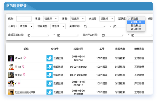 粉丝分为开口/互动/沉默三种类型,直观了解所有粉丝互动情况。