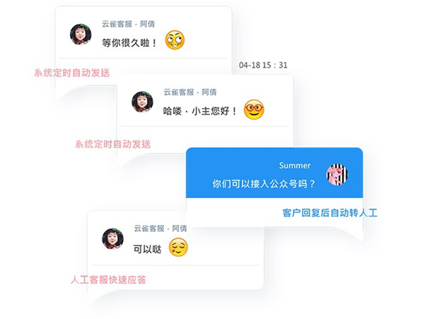 系统自动发送话术,客服开口后自动转接人工,免去客服主动沟通,频繁操作的困扰。