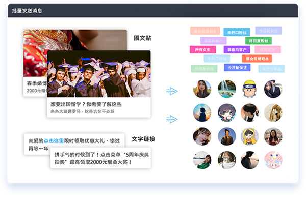 文字、表情、图文贴、链接、图片,都可一键批量发送给你的粉丝,省时、省力、省心。