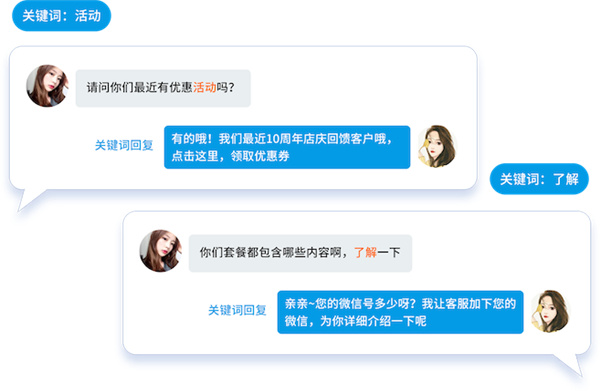 对高频问题设置关键词回复,可回复图文链接、小程序卡片、小程序链接等,多公众号公用,为粉丝提供24小时自助服务。