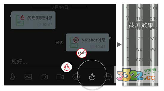 阅后即焚消息在阅读后立即焚毁,不留痕迹,销毁时间由系统算法控制。No!Shot防截屏消息为阅后即焚增强版,截图无法获取完整信息,并且立即销毁。即时是拍照也很难获取完整信息。