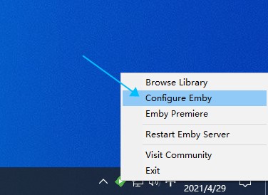 2、右键任务栏上出现的绿色小图标,选择Configure Emby。若出现“Emby Server is loading.”,则等一小会,再刷新该页面。