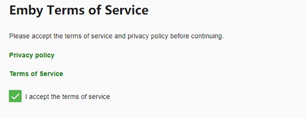 9、最后一步就是同意 Emby 协议的页面了,打上勾勾直接下一步就可以。