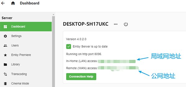 10、最后到达管理页面,可以看到我们公网和内网的ip信息。局域网客户端直接输入内网地址:端口号即可访问Emby Server流媒体。