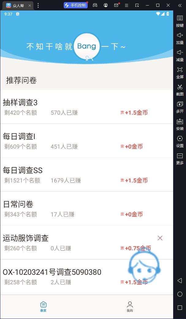 众人帮电脑版是借助安卓模拟器运行在pc端的一个版本。同时也是一款赚钱神器。众人帮电脑版比手机版明显的优势在于支持多开,你可以多开数十个账号,登录后领取悬赏任务、现金奖励,只要你的模拟器闲着没事干,随时随地都能赚钱!你还在等什么?别再抱怨生活费不够花了,快来众人帮,让你的钱包鼓起来!快来试试吧,一起分享生活的乐趣!