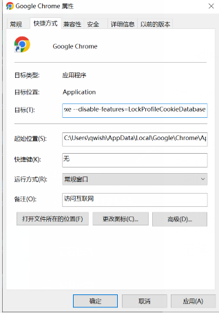 处理方式 ,在桌面的谷歌浏览器处右键,属性,再把这一段加到目标那个框里面:“ --disable-features=LockProfileCookieDatabase ”,注意前面要加个英文字符下的空格。见下面即可。加了要把原来的谷歌浏览器关了重新打开生效。