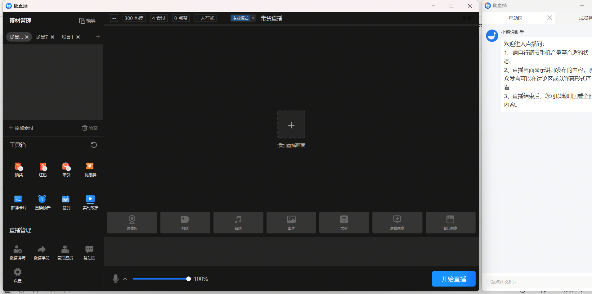 (2)横屏画布/竖屏画布 分别可以使用三个场景,每个场景下可以添加素材。点击场景tab,直播画面跟随切换。