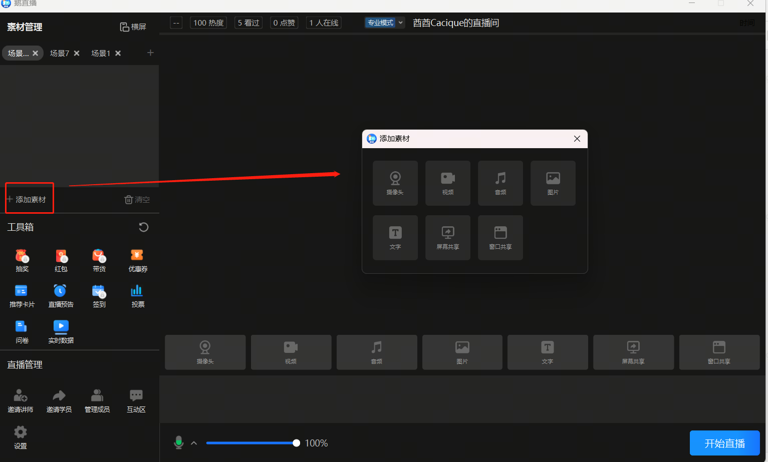 (3)当前可添加素材类型:摄像头、视频、音频、图片、屏幕共享、窗口共享、滚动文字。
