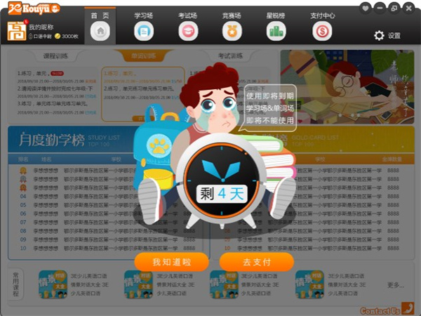 表示您的服务即将到期,到期后各终端"学习场&单词场"将不能继续使用,需要您前往支付中心通过微信或支付宝进行支付后,继续使用全部功能.另外,微信关注3E口语家长通公众号,绑定孩子3E账号后,也可在"个人中心——我的支付"中进行支付.