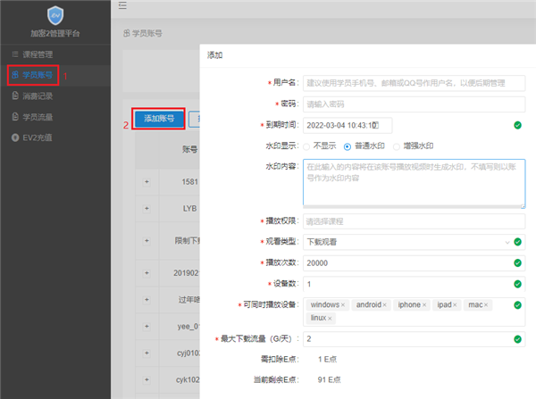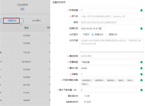 批量创建:如果一个班有多名学员同时购买一套课程,单个设置账号密码费时费力。批量添加账号,账号系统自动生成,密码统一设置。