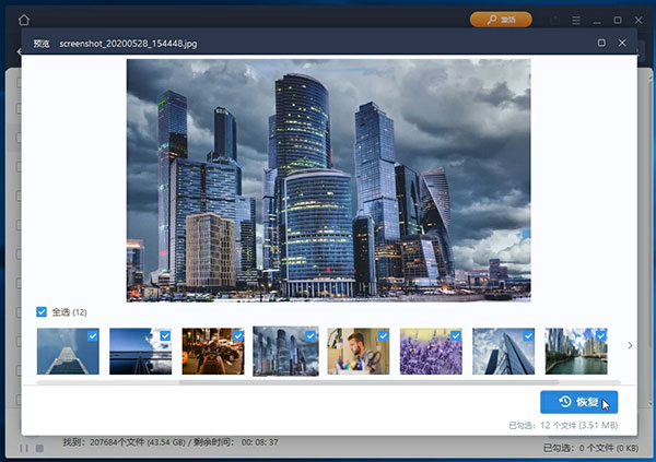 完成查找和预览后,勾选所需恢复的文件,点击『恢复』按钮可将您丢失的文件恢复到您的计算机或存储设备中。