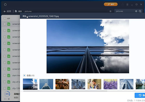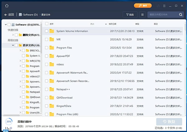 扫描过程中,软件会自动显示已扫描完成的百分比,找到的文件个数及剩余时间。
