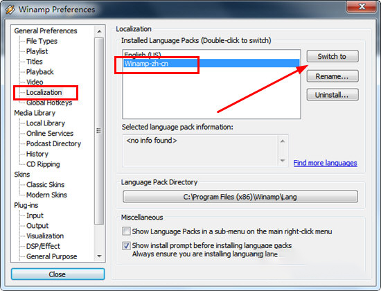 4、在左边的栏目中点击“Localization”栏,选择红框标注内的“ZH-CN”选项,点击其中的Switch to选项即可切换为中文,如下图所示: