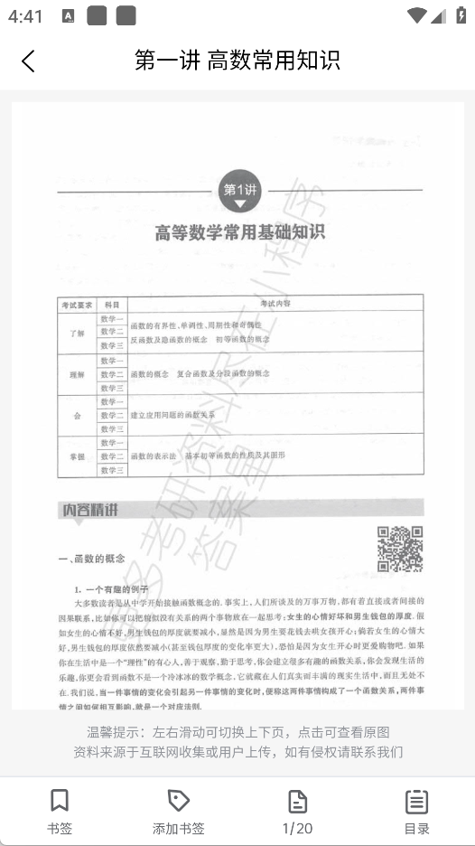 一键扫码即可找到课本对应的学习资料,资料按照课本的章节整理的需要哪个章节就点哪个章节,可添加书签方记录学习进度;