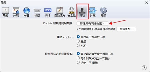 2、将打开的新窗口切换至“隐私”标签页下,之后点击“移除所有网站数据…”按钮。
