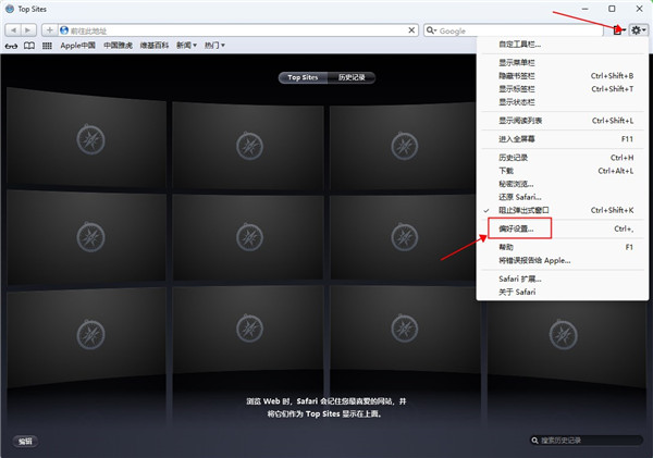 1、打开Safari浏览器后,点击右上角的齿轮图标,之后点击下拉菜单中的“偏好设置”选项。