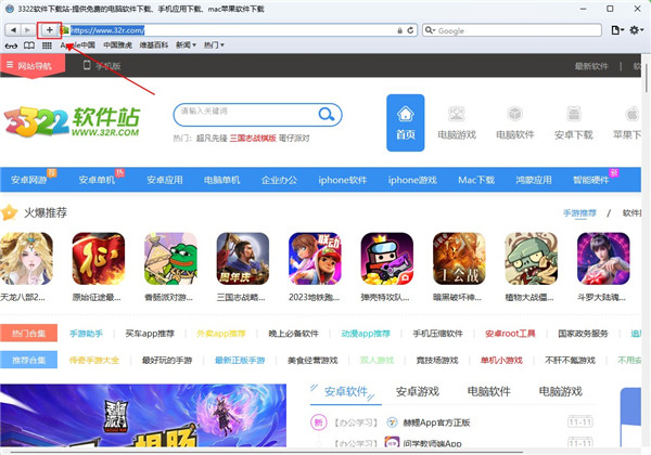 1、打开想要收藏的网页后,点击上方地址栏左侧的“+”按钮。