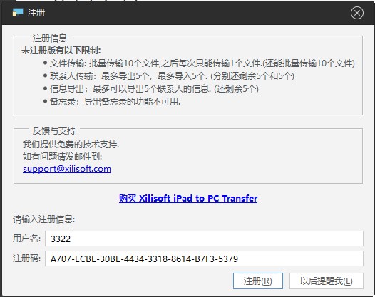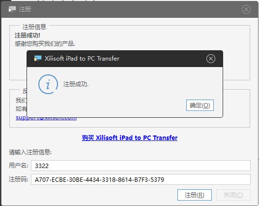 7、将生成的注册码复制到Xilisoft iPad to PC Transfer的注册框中,用户名随意填写即可