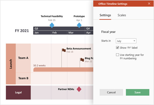 Office 时间线可帮助您几乎立即在 PowerPoint 中制作时间线、甘特图和泳道。只需点击几下即可自定义它们,以创建每个人都能理解的清晰、优雅的高级演示文稿。