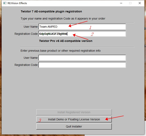 6、然后在User Name中输入【Team AMPED】,Registration Code中输入【6dpSqNUJGFZ9gWxk】,之后点击【install Demo or Floating License Version】。