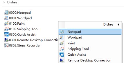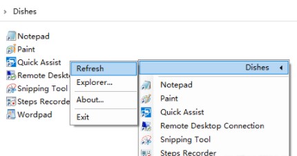 选择 Dishes -> Explorer,可以打开 Dishes 的启动文件夹,默认是disher运行目录下的 Dishes 文件夹。你可以把任何快捷方式、批处理或是可执行文件放进这个文件夹,点击 Dishes -> Refresh 刷新后,它们就会出现在 Dishes 的右键菜单里。