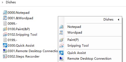 在你的文件或文件夹名字中插入 & 符号并紧跟一个字母或数字,即可将符号后面的字母或数字设置为快捷键。打开菜单后,按对应的快捷键即可启动项目。例如,&Dishes 的快捷键为 D,而 我的电脑 (&E) 的快捷键为 E。