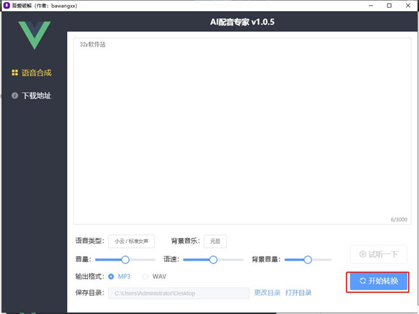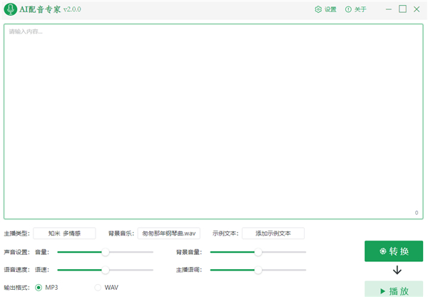 本站为用户提供AI配音专家免费版,这个版本由爱破解坛友上传,已经免去了用户使用注册码注册的环节,也无需安装,亲测可用,并且里面附带了部分背景音乐包,有兴趣的小伙伴快来下载体验吧!