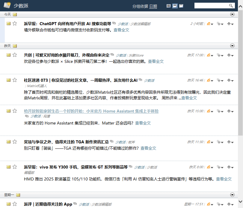 当您选择一个feed和文件夹时,FeedDemon会将报纸过滤器筛选过的条目以报纸的形式显示以便于阅读,而报纸过滤器则用来决定哪些条目被显示(默认情况下只显示已标记的或未读的条目)