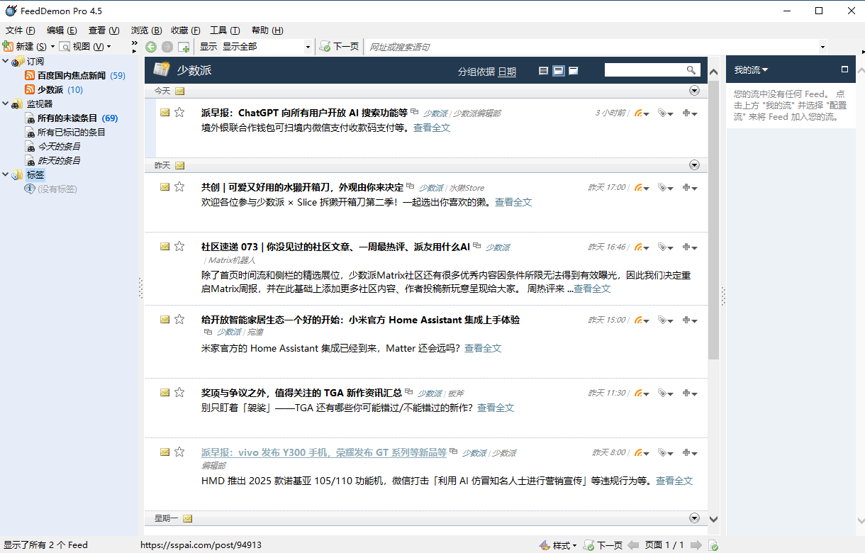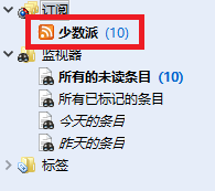 FeedDemon的feed栏会显示出您所有的feed和文件夹,所谓的feed就是条目(文章)的来源,举例来说,纽约时报的RSS feed就包含了最新的几则新闻报道,所谓的文件夹则是feed的群组,您可以使用文件夹来对您的feed进行分类整理