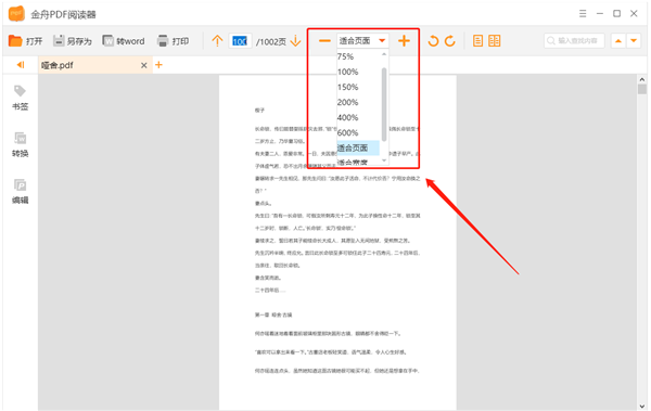 阅读PDF文件过程中,可以更加文件的具体内容进行PDF阅读界面的缩放,调整到适合的阅读页面大小。