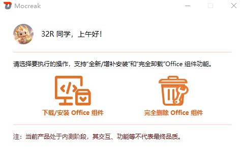 本软件旨在提供正版 Office 部署服务,且仅面向以研究、学习 Office 软件为目的的用户。Mocreak 会延续一贯的精神:不收取任何费用、不内置任何形式的广告、不篡改任何系统文件。