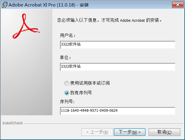 4、之后弹出软件安装注册信息,默认用户名及单位位为3322软件站,勾选我有序列号,输入以下,点击下一步