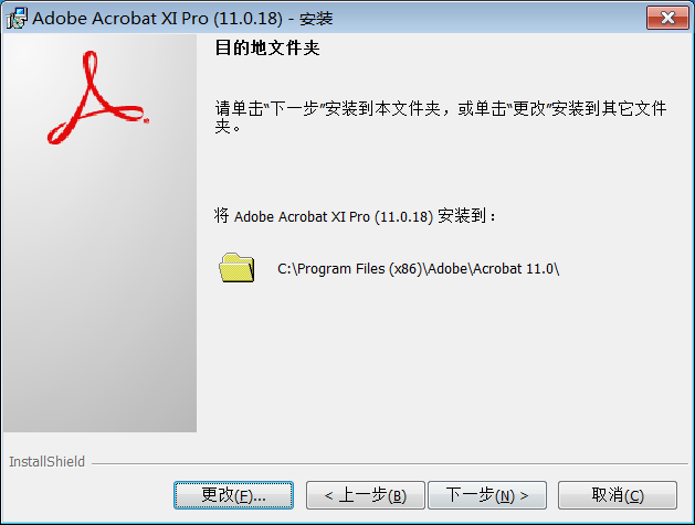 7、安装软件文件夹目录位置C:\Program Files (x86)\Adobe\Acrobat 11.0\,修改点击更改按钮,点击下一步