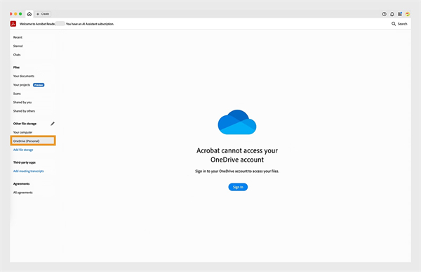 Acrobat 已更新其连接到您的 OneDrive 个人存储帐户的方式。打开现有 OneDrive 帐户时,系统可能会提示您重新连接并授予 Microsoft 访问存储在 OneDrive 上的文件的权限。