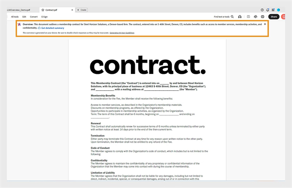 Acrobat 现在会显示文档的简要概述,让您快速了解内容。您可以选择获取详细摘要以获取更多见解。设置首选项,以在打开文档时默认显示概述。