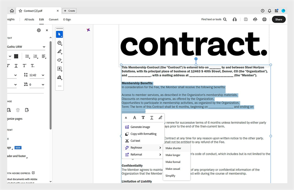 现在,您可以使用 AI 助手更快、更高效地编辑和改进文档。选择内容并从改写选项中进行选择,例如缩短/扩写文本、使用正式/非正式语气,或简化文本。您还可以立即将内容重新格式化为项目符号、列表或段落。每条建议生成后,您可以点赞、点踩或重新生成结果。