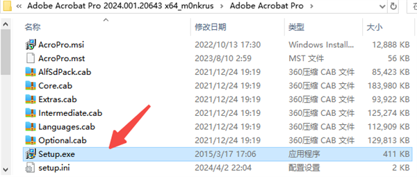 1、解压后,打开Adobe Acrobat Pro文件夹,以管理员身份运行【Setup.exe】;