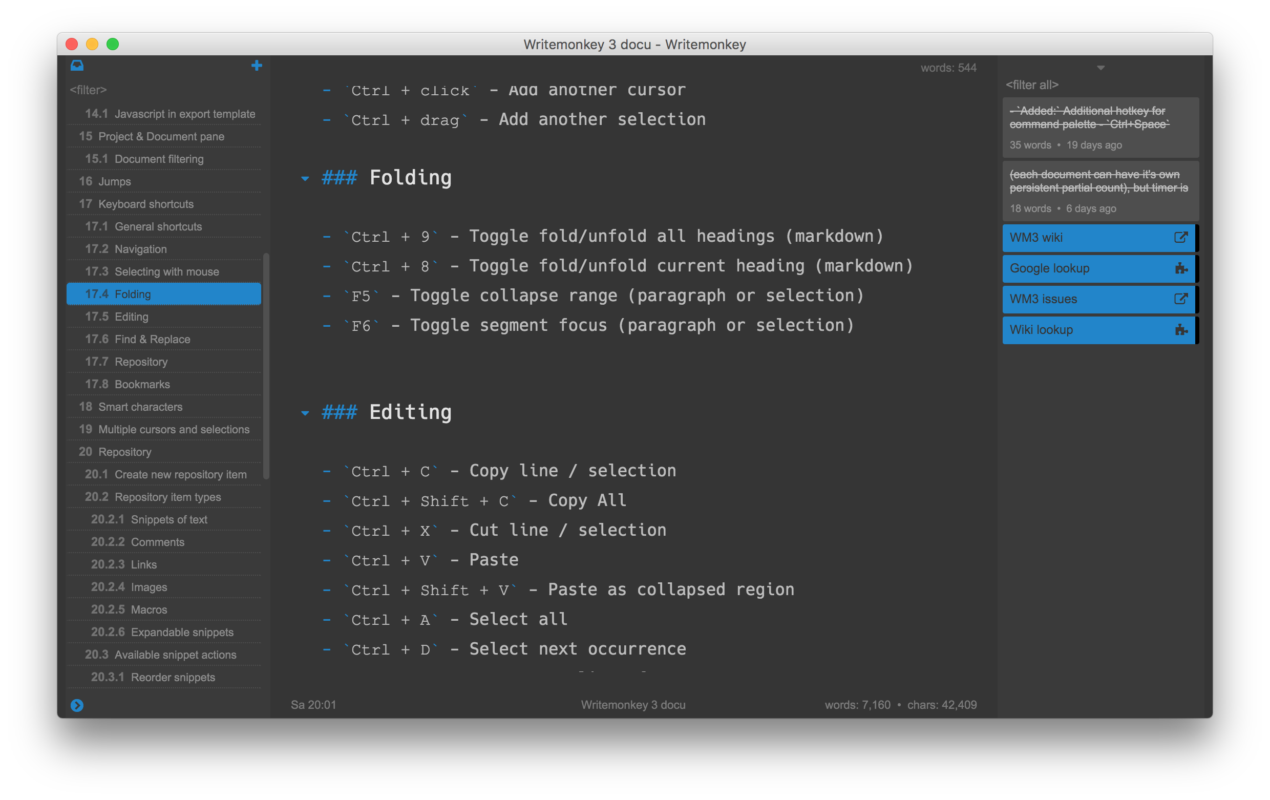 WriteMonkey有许多针对写作的基本功能,包括主/备用文件、跳行和查询等,统统都可以在右键选单中找到。