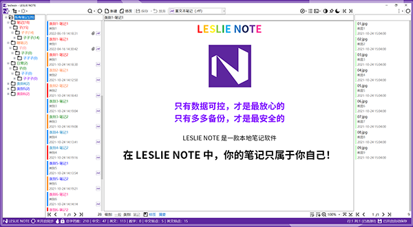 LESLIE NOTE 的基本存储单位是【笔记簿】,【笔记】存放于【笔记簿】中,【笔记】可以添加【附件】。