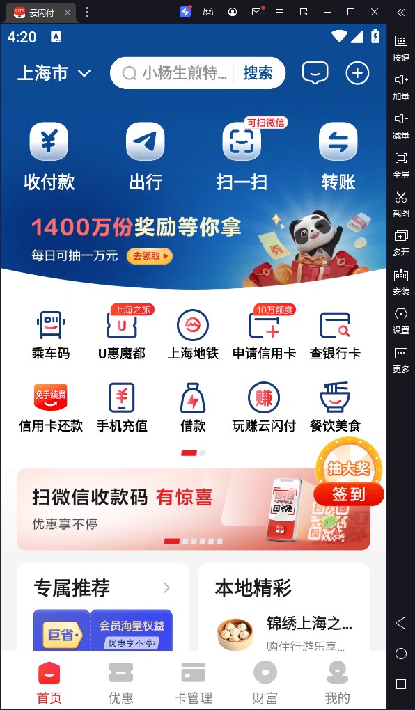 云闪付电脑版是需要借助模拟器在电脑上运行的一款移动支付软件,旨在为用户提供便捷、安全的支付体验。云闪付提供了便捷的银行卡管理功能,一键就能管理和查看自己的银行卡信息,更有手机充值、缴费、转账、在线办卡等功能,让用户验享受便捷高效的一站式服务。此外,云闪付电脑版有着丰富的银行卡优惠活动,涵盖了各个领域,让用户在消费过程中享受到更多实惠和福利。
