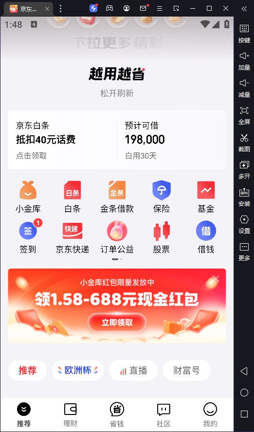 京东金融电脑版是需要借助模拟器在电脑上运行的金融服务软件。软件以智能化和内容化为核心,与银行、保险公司、基金公司等金融机构紧密合作,为用户提供专业、安全的个人金融服务。京东金融电脑版通过创新科技和丰富的金融产品,提供了个人理财、信贷、保险、投资等一站式功能服务,让用户可以获得更智能更个性化的金融方案。