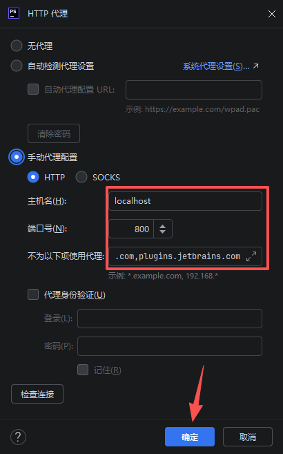 8、选择手动代理配置——HTTP,主机名localhost,端口号80,以下项目不用代理: *.github.com,plugins.jetbrains.com,并点击确定。(避免激活后提示许可验证失败反弹)