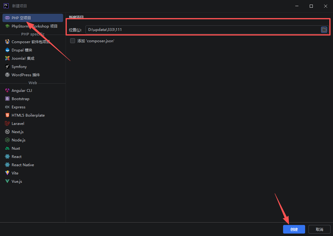 1、点击界面左上角的“PHP空项目”,随后选择项目保存位置,点击右下角的“创建”。