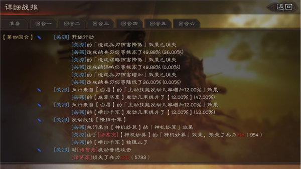 来到第三回合,司马懿连续三回合使用战法智计降低敌方武力输出,然后发动战法落雷攻击了敌方被智计削弱了智力的关羽,在攻击敌人同时为自身恢复了不少伤兵。随后,张飞和关羽不再有之前的好运气,张飞没有发动战法,关羽再次被诸葛亮的神机妙算打断了战法横扫千军,赵云也只是普通攻击,借此机会,周瑜使用神火计,配合鹰视狼顾恢复了496兵力,使用刮骨疗毒恢复了自身1776兵力,兵力恢复到5000+,而敌方此时关羽只剩下两千余人。后面普攻也攻击到关羽,关羽兵力告急。