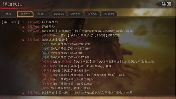 首先司马懿靠着八门金锁阵占到了先攻,使用战法智计降低了敌方两人61.44点武力、智力,并且触发了鹰视狼顾效果。