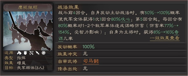 一起来分析一下这个战法。首先作为一个指挥战法,分为前4和后4回合两个效果。前期以法术吸血为主,主稳健,后期谋略伤害为主,主攻。暗符李世民对司马懿的评价“夫征讨之策,岂东智而西愚?辅佐之心,何前忠而后乱?”,前期司马懿帮助曹丕登上帝位,后期高平陵之变架空曹魏。由于他独特的战法,他的用法也分为两类: